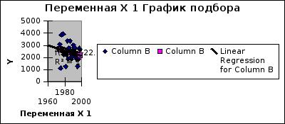 В данной программе воспользуемся линейным регрессионным анализом, который заключается в подборе графика для набора наблюдений с помощью метода наименьших квадратов. Для расчетов воспользуемся «Пакетом анализа». Последовательно вводим годы и соответствующие им значения. Далее в меню «Сервис» находим анализ данных и в «Пакете анализа» выбираем параметр «Регрессия». В окне «Регрессия» задаем входной интервал Y - исходные данные и интервал Х - годы; отмечаем флажком опцию «график подбора». Итогом расчетов является получение графика зависимостей и необходимого уравнения. Критерий достоверности результатов в данной программе — квадрат коэффициента корреляции должен быть больше 0,36.