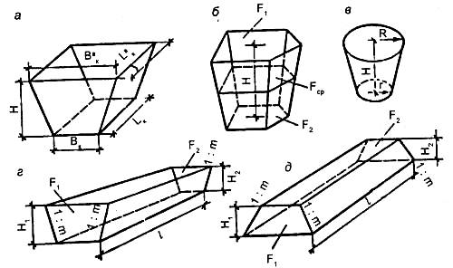 Рис. 1. Схема для определения объёмов земляных работ при устройстве котлованов различной формы, траншей, насыпей: а, б, в — котлованы прямоугольные, многоугольные, круглые; г — траншея с откосами; д — насыпь