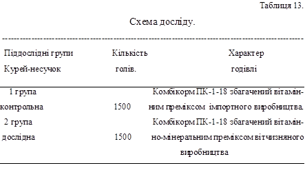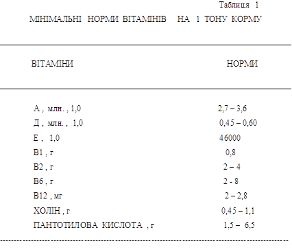 Дослідження В. І . Георгівського /1979/, Л. Е. Ботка /1975 /, Г. О. Богданова /1990/ довели,що потреба птиці у вітамінах та мінеральних речовинах є незначною,але обов’язково повинна бути збалансована і забезпечена у певному співвідношенні . Відсутність або нестача їх викликає у птиці розлади обміну речовин, що знижує інтенсивність росту та продуктивність курей .