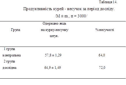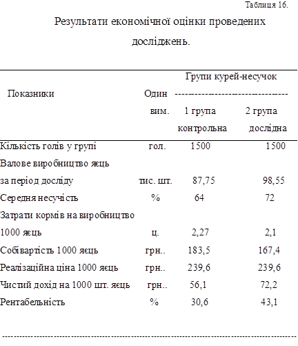 1.На основі проведеного аналізу було встановлено: що дослідні кури-несучки показали вищі результати продуктивності. Так за період досліду отримано 65,7 штук яєць, а валове виробництво яєць становило 197,1 тис. шт., тоді як у контрольних курей-несучок на одну курку одержано 58,5 штук яєць, а валове виробництво яєць відповідно 175,5 тис. шт., що дало можливість при майже однакових затратах кормів на виробництво 1000 яєць отримати чистий дохід на 16,1 грн. Більше у порівнянні із першою контрольною групою курей-несучок.