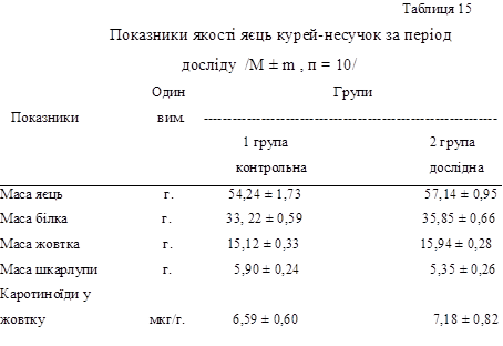 Згодовуючи курям-несучкам другої ( дослідної ) групи .разом із стандартним комбікормом вітамінно-мінеральний премікс, власного виготовлення, сприяє Покращенню якості яєць за рахунок підвищення маси яєць і кількості каротиноїдів у жовтку.