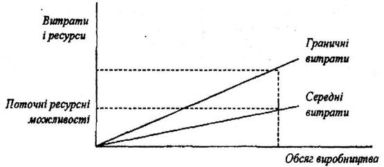 Якщо взяти до уваги, що агропромисловий комплекс у процесі взаємодії з іншими комплексами виступає як єдине ціле, то середні по комплексу витрати набувають змісту узагальнюючої характеристики. При цьому їх обрахування як таке непотрібно: вони слугують орієнтиром для визначення обсягів виробничої діяльності в комплексі на основі порівняння витрат з ресурсними можливостями економіки. Ресурсні можливості при цьому розуміються широко: до їх складу входить насамперед попит, що зумовлює доцільність виробничої діяльності. Низький рівень попиту свідчить про низький рівень ресурсних можливостей економіки. Ці теоретичні положення графічно представлені на рис. 1.1.