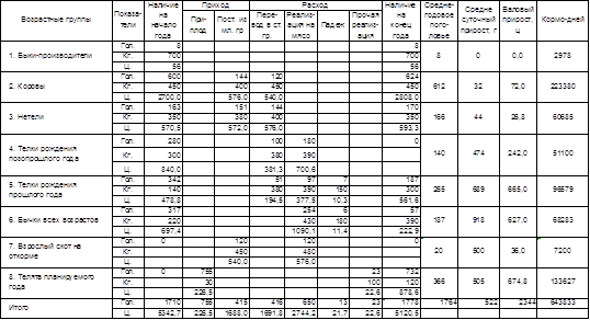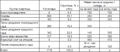 Для составления годового оборота стада крупного рогатого необходимо иметь данные о поголовье животных различных половых и возрастных групп на начало планируемого периода и их живой массе (таблица 1);