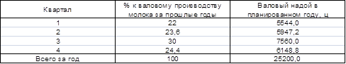 С учетом уровня кормообеспеченности и условий содержания скота в планируемом году намечается получить от каждой коровы 4200 кг молока, соответственно валовой надой составит 25200 ц со средней жирностью 3,6%.