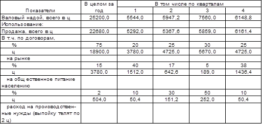 Часть произведенного молока будет использована на производственные нужды. Расход молока на выпойку телятам определяется умножением принятых в хозяйстве норм расхода молока на 1 голову на количество делового приплода. Потребность в продукции животноводства на общественное питание и продажу работникам определяется с учетом конкретных условий предприятия. Вся остальная продукция является товарной и предназначена для реализации за пределы предприятия.