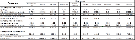 Основными кормами для скота в зимний период являются сено, сенаж, силос, травяная мука из однолетних и многолетних трав, яровая солома, корнеплоды, концентраты (злаковые и бобовые зерновые культуры), а в летний период - зеленые корма сенокосов и пастбищ. Оптимальным считается заготовить на 1 условную голову крупного рогатого скота в молочном скотоводстве не менее 40 центнеров корм. ед., а в мясном - 30 центнеров корм. ед. (т.е. в сутки в молочном скотоводстве на 1 условную голову должно приходиться 11 корм, ед., а в мясном скотоводстве - 8 корм. ед.). Эти нормы приняты из расчета, что на 1 кг молока затрачивается 1 корм. ед. (в лучшем случае тратится 1,3 корм, ед., в худшем -1,7 корм, ед.), а на 1 кг мяса в живой массе - 8 корм. ед. (в лучшем случаи - 10, а в худшем - 15-20 корм. ед.).[2]