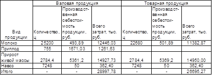 В отраслях, где производится один вид продукции, производственная себестоимость определяется делением общей суммы затрат на объем производимой продукции, а при получении нескольких видов продукции: молоко (основная), приплод (сопряженная) и навоз (побочная) производственная общая сумма затрат уменьшается на стоимость побочной продукции, а основная часть распределяется на основную и сопряженную.