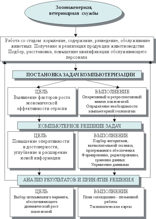 Общая схема компьютеризации в животноводстве представлена на схеме (рис. 1). Мероприятие осуществляется на основе трех взаимосвязанных и взаимообусловленных компонент, с участием специалистов разного профиля. Так, постановка задач, анализ результатов и принятие решения входят в компетенцию зооинженеров и ветеринарных врачей. Компьютерное решение задач до последнего времени выполняли профессионалы в области вычислительной техники. С появлением новых поколений персональных компьютеров и программного обеспечения стало возможным решение поставленных задач при помощи ПЭВМ непосредственно специалистами животноводства. Такой подход к компьютерной технологии, особенно в племенном животноводстве, следует признать наиболее перспективным.