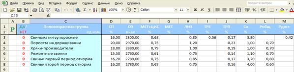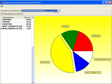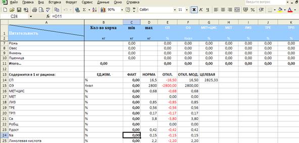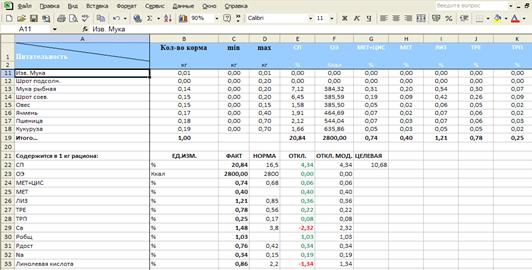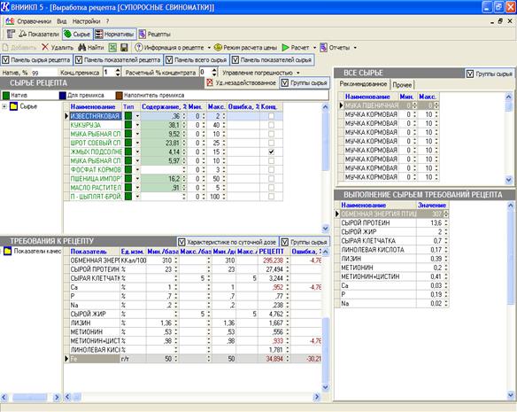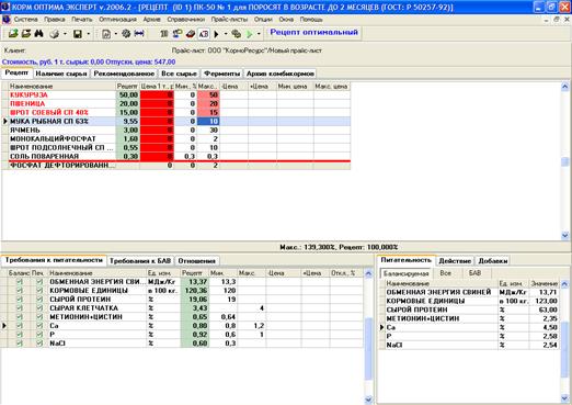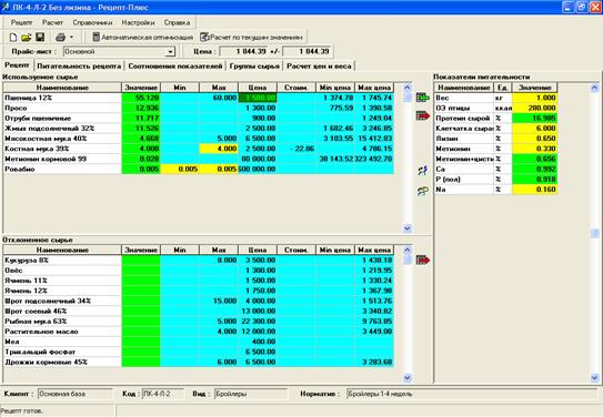 , и программа подбирает такое количество отдельных питательных компонентов, которое в сумме удовлетворяло бы потребность животных. В случае если оптимизатору не удается найти необходимое решение, имеется возможность рассчитать рецепт по текущим значениям, при помощи команды