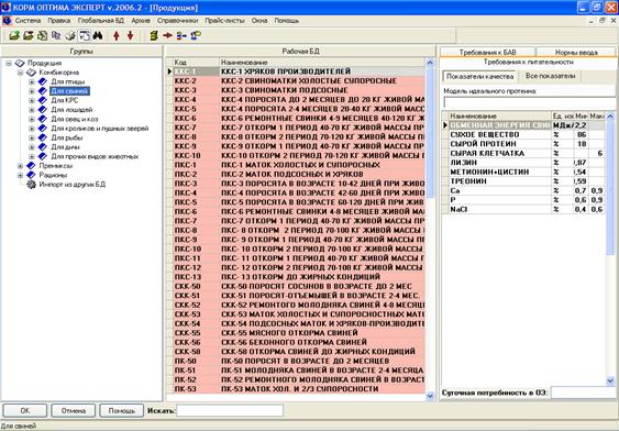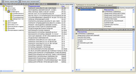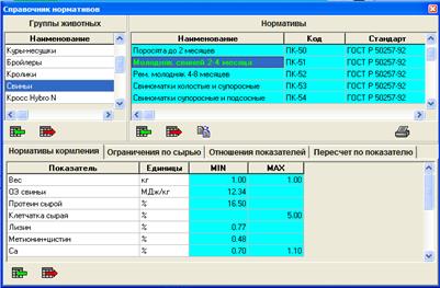 - Заложены справочники нормативов кормления различных групп животных, причем справочник охватывает весь диапазон требований к рецепту: по питательности; по соотношению показателей питательности (например: энерго-протеиновое, кальциево-фосфорное и прочие соотношения).