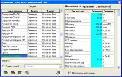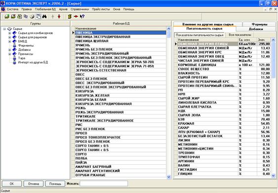 В справочнике сырья (рис. 6) находится все сырье, которое может быть использовано при составлении рациона. Оно классифицировано по группам. Также в базе имеется информация о питательности каждого кормового элемента. Программа позволяет добавить, удалить либо скорректировать любой элемент базы, используя соответственно команды