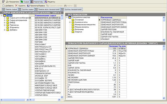 Базу кормов можно редактировать в классификаторе сырья (рис. 11.). Можно добавлять/удалять кормовые компоненты, редактировать содержание питательных веществ в каждом из них.