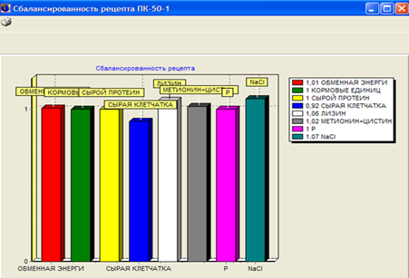 После расчета рецепта в данном приложении имеется возможность проанализировать сбалансированность рецепта, используя соответствующий график (рис. 13). Чем меньше отклонение величин от единицы, тем рацион ближе к необходимой питательности.