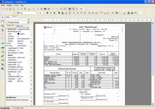 Для оформления отчета с рассчитанным рецептом в приложении есть окно с множеством настроек (рис. 14). Здесь автоматически сформированному отчету можно придать любой вид путем редактирования. Имеется возможность работы со шрифтами, изображениями и их настройкой. Это очень удобно для добавления эмблемы и информации о предприятии.