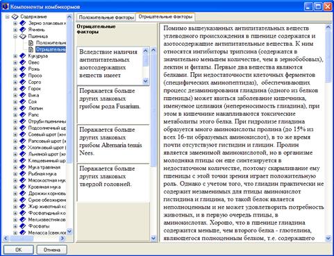 Приложение имеет развернутую справочную систему. Особенностью данной системы является наличие двух блоков под названием «Компоненты комбикормов» и «Компоненты премиксов», которые имеют в своем составе справочную информацию по всем питательным компонентам комбикормов и добавок. Данные блоки являются незаменимыми помощниками специалиста при составлении рецепта кормления, они систематизированы по видам кормовых компонентов, удобны в использовании (рис. 15).
