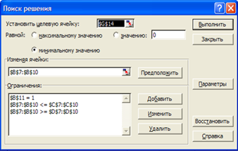 Для использования данного пакета вначале необходимо определить целевую ячейку. В нашем случае целевой ячейкой будет модуль суммы отклонений содержания питательных веществ в рационе от нормы их введения. Целью оптимизации является снижение данной величины, т.к. чем меньше отклонение от нормы, тем более сбалансирован рацион. Поэтому в окне надстройки устанавливаем переключатель в положение «минимальному значению» (рис. 20).