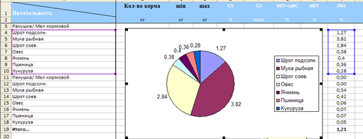После того как лимитирующий показатель найден, можно изучить содержание данного элемента в различных кормовых источниках при помощи структуры питательности рецепта, (рис. 12). Данный график наглядно иллюстрирует содержание какого питательного элемента рациона необходимо увеличить, чтобы достичь сбалансированности смеси.