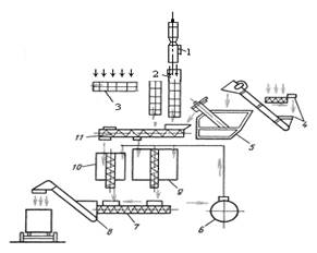 Рисунок 2- Технологическая схема кормоприготовительного цеха КЦС-100/1000. 1- измельчитель; 2 - транспортер; 3- питатель концкормов; 4 - транспортер корнеклубнеплодов; 5 - мойка-измельчитель корнеклубнеплодов; 6 - насосная установка; 7 - выгрузной шнек; 8 - выгрузной транспортер; 9-смеситель; 10 - варочный котел; 11 - загрузочный сборный шнек.