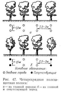 Полезащитные полосы создают чистые и смешанные. Как правило, они имеют только одну главную породу. В некоторых случаях для ускорения защитного действия полосы из дуба и Других медленнорастущих пород в опушечный ряд вводят быстрорастущую породу. Полезащитные полосы 2—3-рядные создают только из главной породы. При подборе древесных пород надо стремиться к тому, чтобы создать такие лесные полосы, у которых на протяжении всей их жизни можно было бы без значительных трудовых затрат поддерживать конструкцию, обеспечивающую их высокую защитную и мелиоративную роль при успешном росте и хорошей биологической устойчивости. В качестве главных пород используют дубы черешчатый, красный, березу бородавчатую, тополя, акацию белую, вяз перисто-ветвистый, лиственницу сибирскую и др., в качестве сопутствующих пород — клены, липу, рябину, вяз обыкновенный, черешню, яблоню и др. При подборе древесных пород необходимо пользоваться рекомендациями, изложенными в инструктивных указаниях, с последующим уточнением применительно к конкретным условиям.