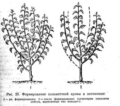 У саженцев на сеянцевых подвоях идусенах к основным побегам добавляют еще один (запасной), который размещается ниже или между ними. У саженцев, привитых на парадизке иайве, предназначенных для закладки шпалерных садов, оставляют, но два запасных победа, находящихся ниже основных разветвлений. Все остальные ветви в кроне, в том числе и конкуренты проводников, вырезают «на кольцо».