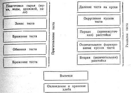 Этапы приготовления хлеба способом брожения можно разделить на три: приготовление теста, куда включают и подготовку сырья, обработку теста (его разделку) и выпечку (см. схему).