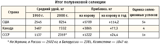 По данным ФАО, за период с 1969 по 1989 г. хуже нас в мире прирастали удоем только Австралия и Франция (соответственно на 13,1 и 4 кг на корову в год). Причем у французов есть «оправдание»: сыропригодность молока они ценят выше всех других показателей. Десять стран лидеров с более чем миллионным поголовьем имели следующий ежегодный прирост молочной продуктивности: Англия — 38,1 кг, Италия — 41, Испания — 43,5, Германия — 45,5, Польша — 46,3, Ирландия — 72,5, Япония — 74,1, Нидерланды — 79,8, США — 105,4, Канада — 123 кг на корову в год.