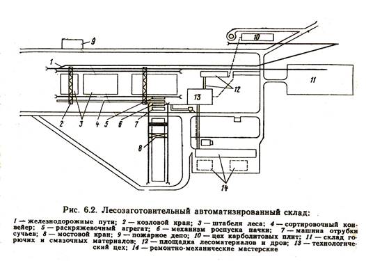 На рис. 6.2 показан автоматизированный склад с грузоперера-боткой 300 тыс. м3, оборудованный мостовым краном 8 пролетом 31,5 м с двумя тележками грузоподъемностью 30 т для выгрузки деревьев с кроной из автомобилей и прицепов. Производительность крана 1500 м3/смену. Для обрубки сучьев применена машина 2МГС 7 (ЦНИИМЭ). Ее производительность немного больше 1 м3/мин. На складе применяется также сучкорезная машина, обрабатывающая пачку деревьев в объеме полного воза.