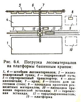 Для складов, где отгружаются сортименты леса, преимущественно средней длины и длинномерные, рекомендуется применять башенные краны (рис. 6.4) с тросовыми стропами или грейферами ВМГ-5, ЛТ-153 и др., а для выравнивания торцов бревен— торцеватель ТГПК-1. Стойки заготовляют на отдельной площадке, оснащенной трехпиль-ным или фрезерным станком для окантовки одного конца стоек, а для фиксации стоек используются переносные эстакады. При формировании «шапки» jia вагоне используется специальный шаблон. Состав бригады рекомендуется 3—4 чел. в зависимости от захватного оборудования крана. Для сортиментов круглого леса средней длины и длинномерного широко применяются консольно-козловые краны, но вместо переносных эстакад рекомендуется применять стационарные эстакады с прижимными устройствами для фиксации стоек при погрузке. На одной и той же площадке лесного склада могут быть специализированные участки для погрузки короткометражного леса в полувагоны и длинномерного на платформы.