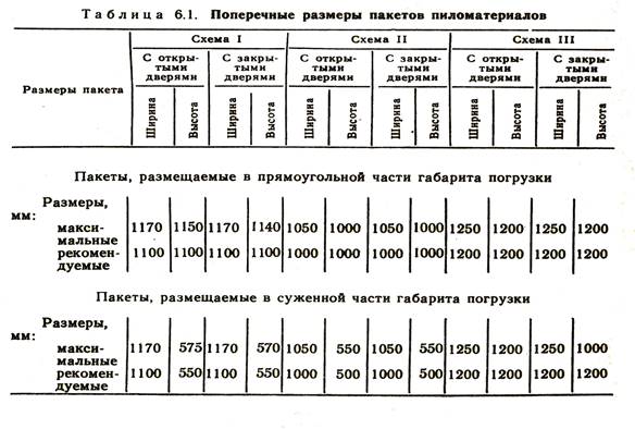 Свердловским научно-производственным лесозаготовительным объединением и Алапаевским деревообрабатывающим комбинатом разработаны три новые схемы размещения и крепления пакетов обрезных пиломатериалов прямоугольного сечения в полувагонах, включая верхнюю суженную часть габарита погрузки. Пакеты имеют различные поперечные размеры, формируемые на лесопильно-деревообрабатывающих предприятиях для поставки на экспорт в социалистические и капиталистические страны. Размеры пакетов даны в табл. 6.1. Полувагоны, загруженные пакетами пиломатериалов по новым способам, прошли все виды испытаний, предусмотренных требованиями МПС [14].