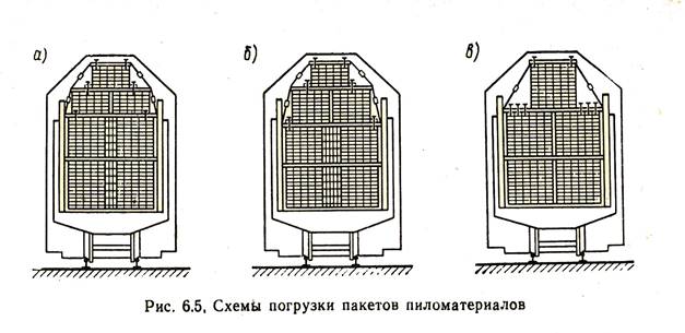 Подготовка и погрузка пиломатериалов на лесозаготовительных и деревообрабатывающих предприятиях выполняются одновременно с сортировкой и формированием пакетов, для чего на ряде предприятий на сортировочных площадках устанавливаются шаблоны с вертикальными стойками, определяющими размеры пакета. Пакеты пиломатериалов на участок погрузки подаются автолесовозами, автопогрузчиками, кранами или другими транспортными средствами. Пакеты скрепляют полужесткими многооборотными стропами, стальной лентой, проволокой, брусково-проволочной обвязкой, а также водонепроницаемой оберткой (экспортные пиломатериалы)4 либо на сортировочной площадке, либо на участке погрузки. Технология погрузки пиломатериалов аналогична погрузке круглого леса, но для перегрузки пиломатериалов применяются специальные грузозахватные приспособления к кранам и автопогрузчикам.
