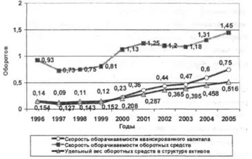 Проследив динамику скорости оборачиваемости авансированного капитала сельскохозяйственных предприятий Луганской области, можно увидеть, что за исследуемый период скорость оборачиваемости авансированных ресурсов из года в год возрастала и в 2005 году достигла значения 0,75, что более чем в 5 раз превышает показатель 1996 года. Это происходило, в основном, за счет увеличения доли оборотных средств в структуре активов, удельный вес которых за анализируемый период возрос более, чем в 3 раза и в меньшей степени за счет ускорения оборачиваемости оборотных средств, поскольку значительное ускорение кругооборота в сельскохозяйственном производстве ограничено природными факторами (рис.3).