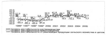 За исследуемый период эффективность сельскохозяйственного производства в Луганской области изменялась неоднозначно (рис.4). Так рентабельность производства продукции растениеводства с 1996 года имела тенденцию к снижению. Начиная с 1999 года, после осуществления разгосударствления сельскохозяйственных предприятий и образования предприятий, новых организационно-правовых форм хозяйствования, наметился рост рентабельности продукции растениеводства, который в 2003 году достиг своего пика и составил 61,1 %. Однако, эта положительная тенденция сменилась на противоположную и уже в 2005 году уровень рентабельности растениеводческой отрасли составил всего лишь 7,3 %. Продукция животноводства в отличие от растениеводческой на протяжении всего исследуемого периода оставалась убыточной, и лишь только в 2005 году уровень рентабельности продукции животноводства достиг положительного значения и составил 3,2 %.
