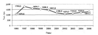 Низкая экономическая эффективность сельскохозяйственного производства отразилась и на процессе воспроизводства. Так, начиная с 1997 года по 2002 год, в сельскохозяйственном производстве Луганской области наблюдался процесс деконцентрации авансированного капитала, что свидетельствует о суженом воспроизводстве авансированных ресурсов. Начиная с 2003 года происходило постепенное ежегодное увеличение стоимости авансированного капитала в расчете на 1 га сельскохозяйственных угодий, что является результатом расширенного воспроизводства авансированных ресурсов. Значительный же скачек концентрации авансированного капитала в 1997 году был обусловлен переоценкой стоимости основных средств (рис.5).