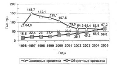 За исследуемый период в сельскохозяйственных предприятиях Луганской области наметилась четкая тенденция увеличения обеспеченности оборотными средствами в расчете на 100 га сельскохозяйственных угодий. В то же время, обеспеченность основными средствами сокращалась на протяжении всего исследуемого периода, кроме 1997 года, в котором была произведена переоценка стоимости основных средств и только, в последние три года, темпы снижения этого показателя несколько приостановились. Тем не менее, ежегодное сокращение основных средств является признаком нарастающей производственной неспособности. То есть, расширенное по стоимости воспроизводство оборотных средств осуществлялось за счет сокращения стоимости основных средств (рис.6).