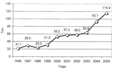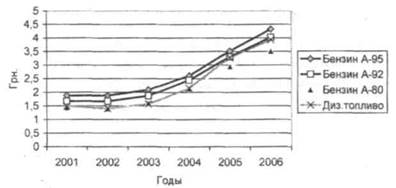 Учитывая структуру потребления нефтепродуктов сельскохозяйственными предприятиями Луганской области и средние цены реализации за последние 5 лет, следует отметить, что увеличение потребления нефтепродуктов в стоимостном выражении было вызвано ростом цен на них, а не потреблением в натуре. Так, в 2001 году средние цены на бензин А-95, А-92, А-80 и дизельное топливо составляли 1,88; 1,67; 1,44; 1,49 грн./л., а в 2005 году 3,52; 3,31; 2,95; 3,28 грнУл. соответственно. За период цены возросли в 1,87 -2,2 раза, а (рис.8).
