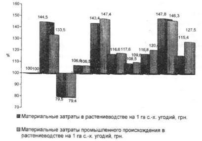За исследуемый период в сельскохозяйственных предприятиях Луганской области лишь только однажды - в 1998 году произошло снижение материальных затрат в отрасли растениеводства в расчете на единицу земельной площади по сравнению с прошлым годом. В остальные годы темпы роста материальных затрат постоянно возрастали не смотря на значительные колебания от 106,6 % - в 1999 году, до 147,8 % - в 2004 году. Темп роста затрат промышленного происхождения практически идентичен росту материальных затрат в целом, лишь только в отдельные годы наблюдается незначительное отличие этих показателей. Следует отметить, что рост материальных затрат не является результатом интенсификации производства, так как за исследуемый период не отмечалось значительного роста эффективности сельскохозяйственного производства.