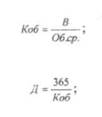 где Коб - скорость оборачиваемости оборотных средств; В - выручка от реализации продукции, работ и услуг; Об.ср. - среднегодовая сумма оборотных средств; Д - длительность одного оборота оборотных средств.