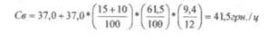 В качестве примера, рассчитаем воспроизводственную себестоимость озимой пшеницы в 2005 году. Средняя фактическая себестоимость 1 ц озимой пшеницы в сельскохозяйственных предприятиях Луганской области в 2005 году составила 37,0 грн./ц. средняя банковская ставка по депозитным вкладам составляла 15 % годовых, доплата за риск принята в размере 10 %, удельный вес материальных затрат в структуре себестоимости составил 61,5 %, средняя длительность закрепления средств в кругообороте при выращивании озимой пшеницы составляет 9,4 месяца. Имея такие данные, получили следующий результат: