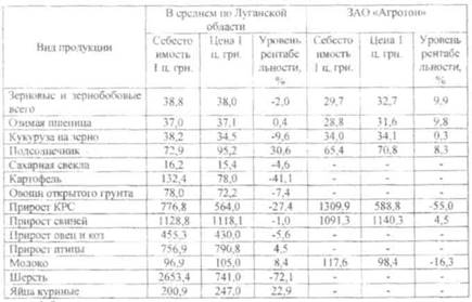 Следует отметить (табл. 1), что использование современной техники и технологий выращивания сельскохозяйственных культур и животных, которые применяются в агропромышленных формированиях, способствует снижению такого показателя как себестоимость продукции. Так, в ЗАО «Агротон», типичном представителе агропромышленных формирований в Луганской области практически по всем видам продукции себестоимость производства Ниже средних показателей по Луганской области. Однако, и цены реализации, по которым продукция передается перерабатывающим предприятиям, входящим в объединение, также ниже среднеобластных показателей.