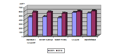 Обобщение мирового опыта свидетельствует, что одним из основных экономических рычагов доведения сельхозпроизводителям бюджетной поддержки, наряду с финансированием целевых программ, выступают цены. На основе трендовых моделей нами перспектировано значительное увеличение цен на отдельные виды зерновых культур в 2012г. в Ставропольском регионе (рис.2). Для получения оптимальной рентабельности зерновой отрасли (60%) их рост должен составить от 9 до 25% по сравнению с 2007г. при сохранении существующей тенденции роста себестоимости продукции.
