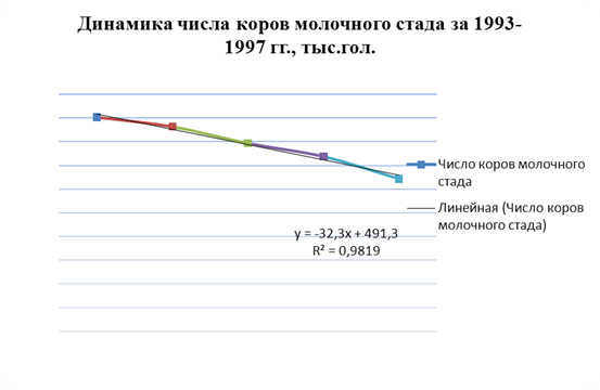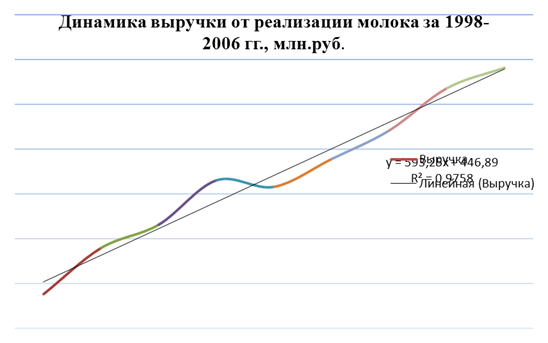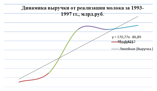 | Средняя за год выручка от реализации молока за год (в млрд.руб. до 1997г.; с 1998 в - млн.руб.) | 425,4 | 3413,1 |