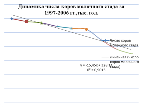 По имеющимся данным нужно провести анализ тенденций изменения показателей за 1993-2006 гг. Для анализа отобраны два взаимосвязанных признака – в качестве результативного взята выручка от реализации молока, а в качестве признака-фактора – число коров молочного стада.