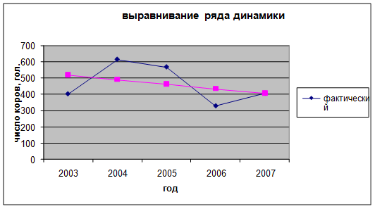 Анализ динамики приводит к тому, что мы имеем год за годом постепенное снижение продуктивности животных. Анализ значений таблицы и графика показал, что численность поголовья коров имеют тенденцию к сокращению и выравненная линия развития (тренд) численности коров, характеризуя основную тенденцию, стремительно падает вниз.