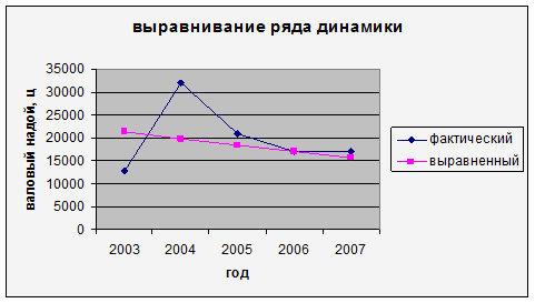 Анализ значений таблицы и графика показал, что валовый надой имеет тенденцию к сокращению также и фактическая линия идет к понижению. Понижению способствовало уменьшение надоя молока и численности коров.