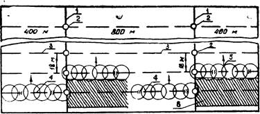 Эксплуатация. Орошаемые участки должны соответствовать ширине рабочего захвата дождевальной установки. В связи с этим трубопроводы оросительной сети укладываются на расстоянии 800 м друг от друга (см. рис.).