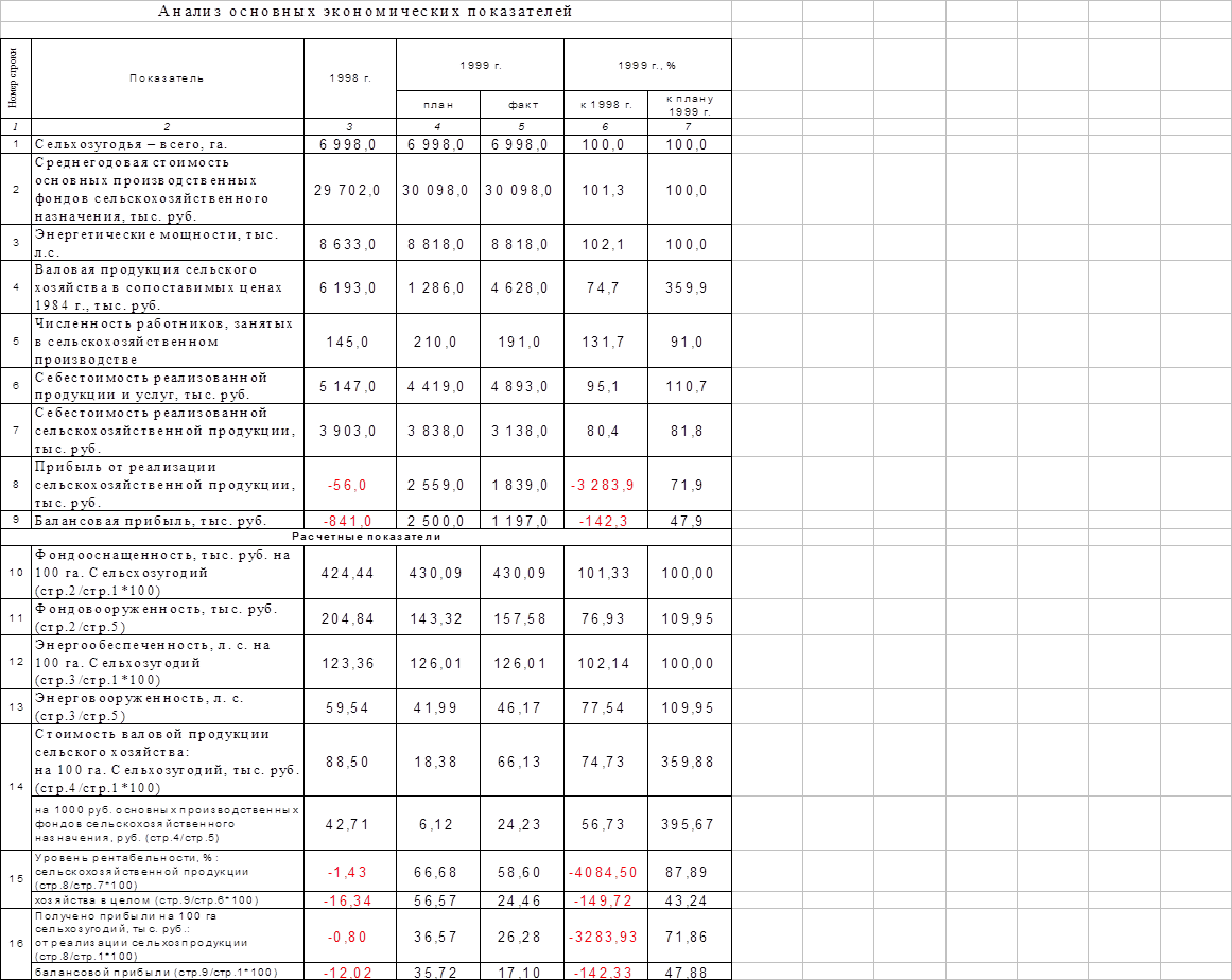 Сложившаяся в данный момент общероссийская экономическая ситуация далеко не благоприятна для производства сельхозпродукции. Из-за непомерно высоких цен на запасные части, комплектующие и горюче-смазочные материалы, сельское хозяйство, как производитель сырья для пищевой промышленности не является рентабельным, о чем свидетельствуют показания в «Анализе основных экономических показателей»