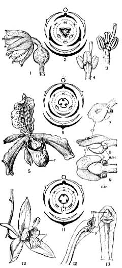 Рис.1. Строение цветков в семействе орхидных (из «Жизни растений») Подсемейство апостасиевые (Apostasioideae), неувидия Ины (Neuwiedia inae): 1. – цветок (чашелистики и лепестки с выраженным килем); 2. – диаграмма цветка; 3,4 – колонка в двух положениях. Подсемейство циприпедиевых (Cypripedioideae), пафиопедилум замечательный (Paphiopedilum insigne): Подсемейство однотычинковых орхидей (Orchidoideae), целогина повислая (Coelogyne flaccida): |
