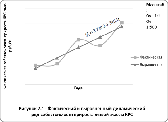 Используя данные о себестоимости прироста КРС (Приложение 1.) проследим изменение ее уровня. Применяя вышеуказанные формулы, произведем расчет показателей, отражающих тенденции изменения себестоимости прироста живой массы КРС. Полученные данные занесем в таблицу 2.1.
