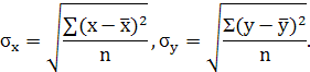 - среднее квадратическое отклонение факторного и результативного признаков соответственно. Рассчитываются по формулам:
