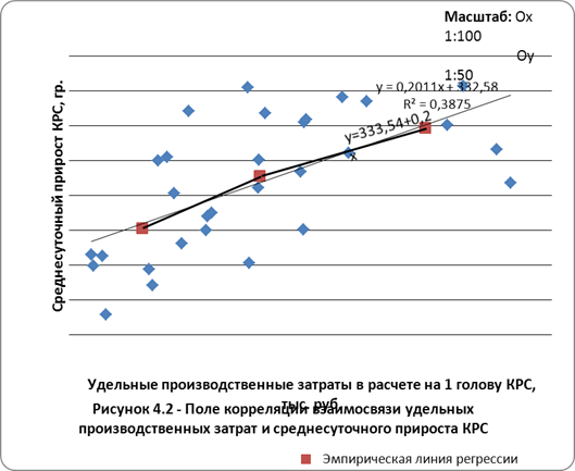 Из уравнения видно, что увеличение удельных производственных затрат на 1 голову на 1 тысячу рублей вызовет увеличение среднего суточного прироста живой массы КРС на 0,2 грамма. Это свидетельствует о существенном влиянии удельных производственных затрат на средний суточный прирост живой массы КРС. Изобразим связь на графике (рисунок 4.2).